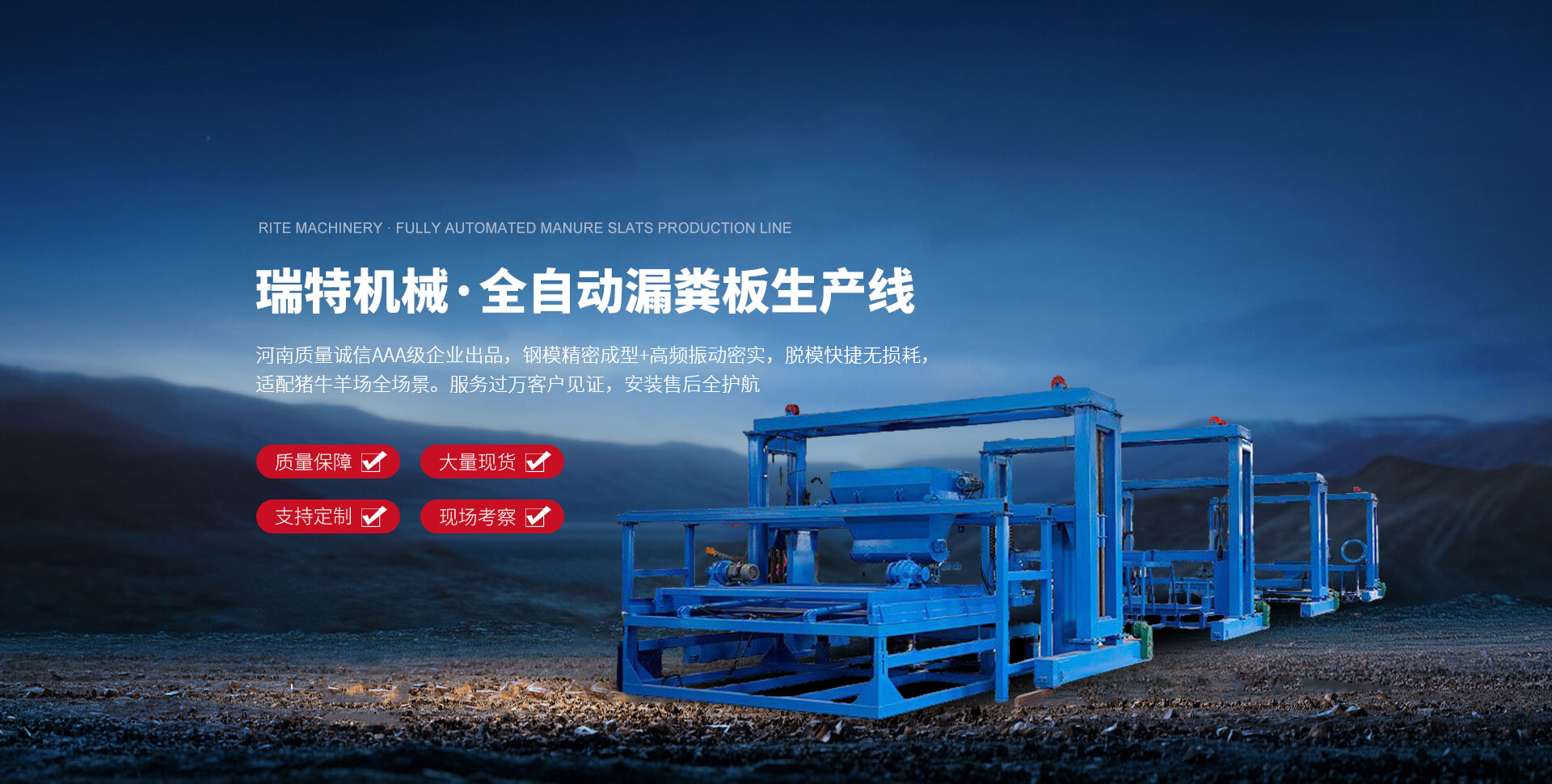瑞特機(jī)械,成立于2010年,致力于預(yù)制混凝土行業(yè)的研發(fā)和生產(chǎn),是一家集生產(chǎn)安裝、制造、銷售、技術(shù)創(chuàng)新、售后指導(dǎo)為一體的高科技機(jī)械企業(yè)。我公司始終秉承“走正道,負(fù)責(zé)任,心中有別人”的經(jīng)營(yíng)理念,一直致力于漏縫板生產(chǎn)線,漏縫板模具的市場(chǎng)推廣和銷售?! ∥夜緭碛泄芾韴F(tuán)隊(duì),研發(fā)設(shè)計(jì)團(tuán)隊(duì),高品質(zhì)的銷售團(tuán)隊(duì),完善的售后服務(wù)團(tuán)隊(duì),并且擁有完善的質(zhì)量管理體系。公司群聚精英,并經(jīng)過(guò)全體員工的共同努力,多次獲得“重質(zhì)量、守信譽(yù)單位”、“河南質(zhì)量誠(chéng)信AAA 級(jí)品牌企業(yè)”、“文明誠(chéng)信企業(yè)”等榮譽(yù)稱號(hào),我公司產(chǎn)品目前已擁有多項(xiàng),奠定了瑞特機(jī)械在水泥制品加工設(shè)備領(lǐng)域的技術(shù)地位?! ∥夜疽浴耙再|(zhì)量取勝市場(chǎng),以價(jià)格立足市場(chǎng),以服務(wù)鞏固市場(chǎng),以創(chuàng)新開拓市場(chǎng)”為營(yíng)銷理念,以“以人為本,創(chuàng)新進(jìn)取,共同發(fā)展”的企業(yè)理念,服務(wù)于國(guó)內(nèi)外農(nóng)牧業(yè),建筑業(yè)、畜牧養(yǎng)殖等行業(yè),并多次與英國(guó)、德國(guó)、丹麥、荷蘭、澳大利亞等畜牧設(shè)備集團(tuán)開展了國(guó)際間的戰(zhàn)略合作,引進(jìn)自動(dòng)化設(shè)備生產(chǎn)線,使產(chǎn)品暢銷國(guó)內(nèi)外,享有國(guó)際盛譽(yù)?! ∑駷橹梗鹛貦C(jī)械服務(wù)的客戶數(shù)量過(guò)萬(wàn),憑借穩(wěn)定的設(shè)備性能在項(xiàng)目應(yīng)用中得到客戶的認(rèn)可和好評(píng),在行業(yè)內(nèi)已經(jīng)完成跨越。  “豫立”建機(jī),竟在瑞特。成績(jī)屬于過(guò)去,目標(biāo)還在未來(lái),瑞特愿與社會(huì)各界有識(shí)之士精誠(chéng)合作,共同發(fā)展,實(shí)現(xiàn)雙贏。